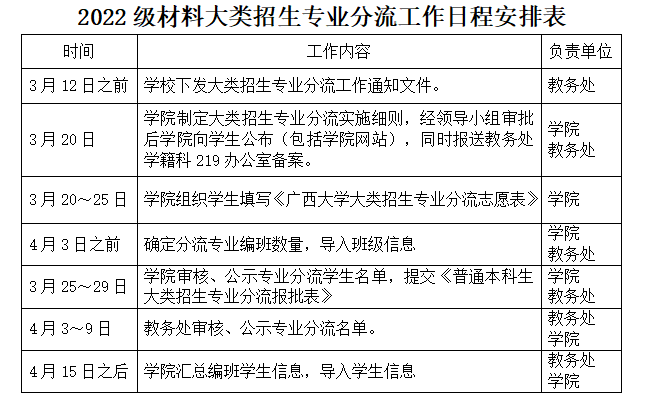 根据《广西大学大类招生专业分流管理办法(2022年修订)》(西大教字〔2022〕106号)精神,为加快推进学校综合改革、“双一流”建设和“部区合建”工作,建设高水平本科教育,提升本科人才培养质量,规范大类招生专业分流工作,经学院讨论研究,特制定资源环境与材料学院2022级材料大类招生专业分流实施细则。