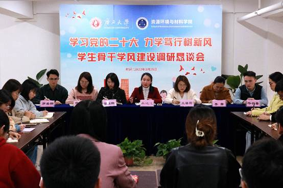 调研恳谈会以“学习党的二十大 力学笃行树新风”为主题。会上,学生骨干代表围绕学风建设问题畅所欲言,对加强学风建设积极建言献策,与辅导员老师就如何实施多项举措狠抓学风,积极引导学生“走出宿舍进教室,杜绝旷课戒游戏,消除挂科苦读书”进行充分交流。师生们达成共识:要构建“学院-班级-宿舍-个人”四级联动+“学习学业—科创竞赛”双向驱动的促学帮学督学模式,充分发挥学生党员、学生干部的示范带动作用,密切家校联系,推动学风建设。
