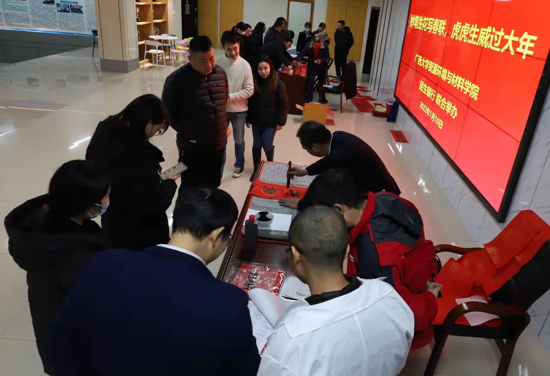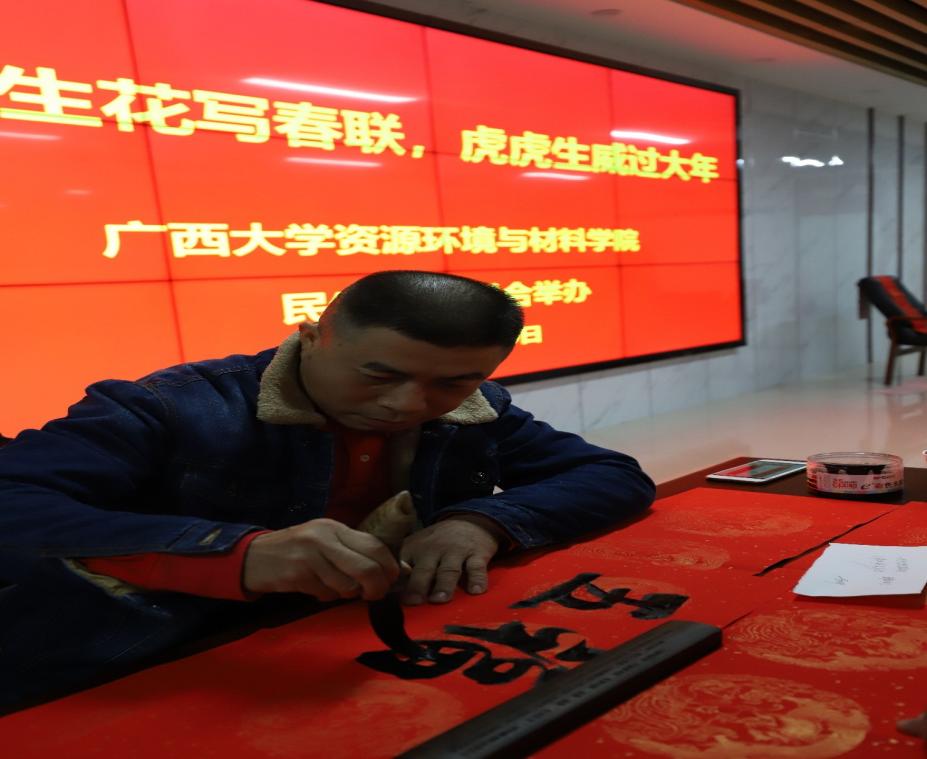 为了营造祥和的节日气氛,2022年1月10日,资源环境与材料学院分工会联合民生银行南宁分行广西大学社区支行和广西华人书画院举办了以“妙笔生花写春联,虎虎生威过大年”为主题的迎新春、写春联、送祝福活动。