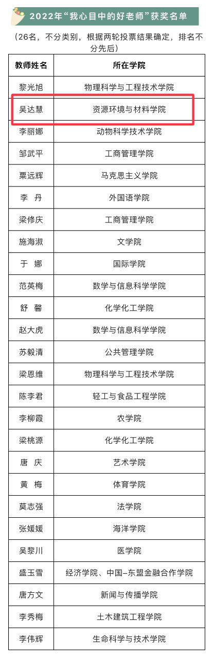 吴达慧老师获评2022年广西大学“我心目中的好老师”