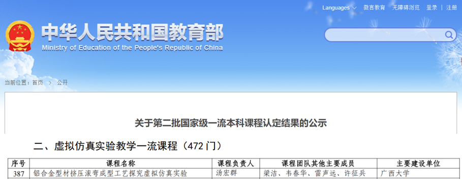根据教育部近日公示的第二批国家级一流本科课程认定结果,我院材料成型及控制工程专业有1门课程入选虚拟仿真实验教学一流课程,实现了该专业核心课程国家级一流本科课程的突破。截至目前,我院共获国家级一流本科课程2门,自治区级一流本科课程5门。