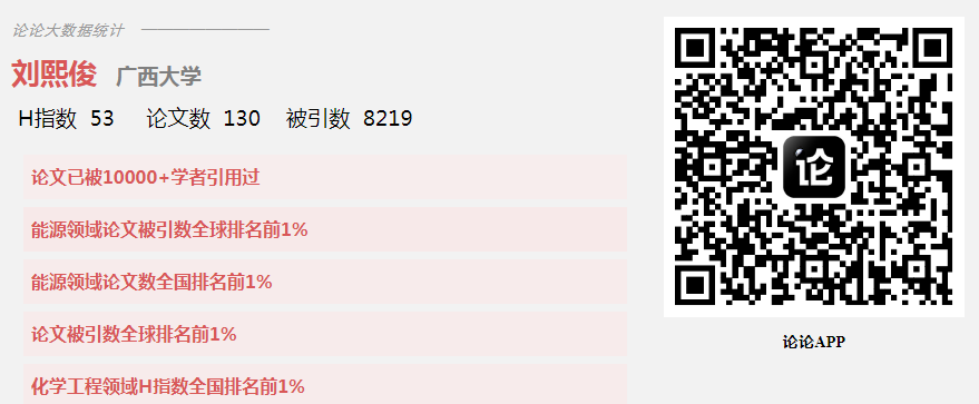 据“论论学术大数据平台“(国家工信部官方备案)最新统计数据,我院刘熙俊教授截止目前已发表高水平学术论文130余篇,论文总被引数累计8200余次,入选论文被引数全球排名前1%,主要研究方向涵盖材料学、化学、能源等领域,在Science Advances、Nature Communications、Journal of the American Chemical Society、Angewandte Chemie和Advanced Functional Materials等期刊累计发表10余篇,个人H指数为53。