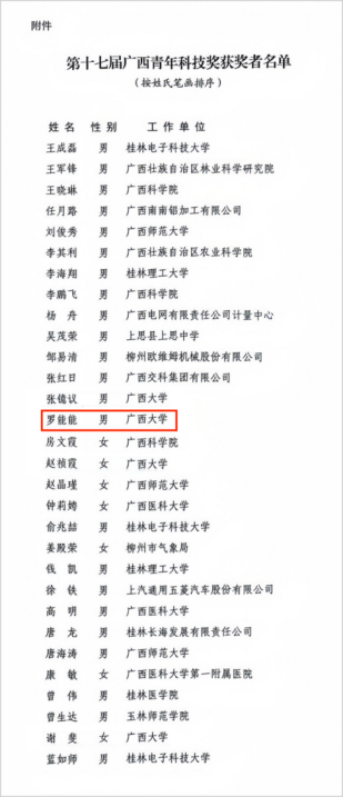 近日,广西壮族自治区科学技术协会第九次代表大会在南宁召开,会上对30名第十七届广西青年科技奖获得者进行了表彰。中国科协专职副主席、书记处书记孟庆海等共同为获奖者颁奖。其中,我院副院长罗能能教授获此殊荣。