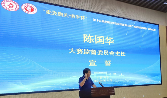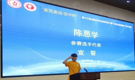 评委委员会代表、广西科技大学闫共芹老师,监督委员会主任、桂林科技大学陈国华老师,参赛学生代表广西大学陈恩学同学依次对恪尽职守参加比赛进行宣誓。
