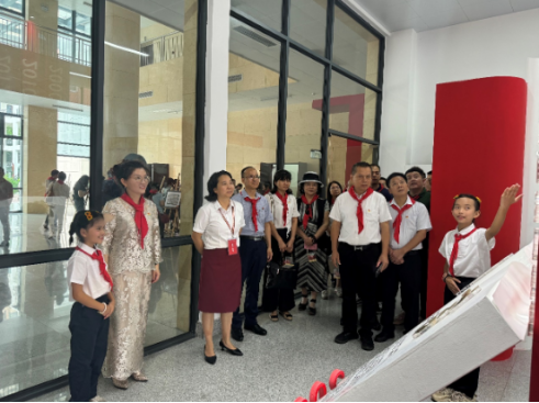 捐赠仪式结束后全体人员在明天学校领导的陪同下参观了学校展览厅、航模工作室、图书室和壮锦非遗传承馆。