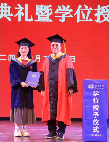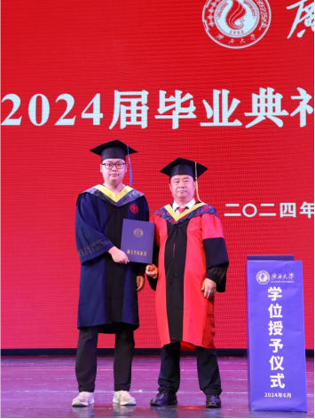 仪式在雄壮的国歌声和集体观看学院制作的毕业祝福视频中拉开帷幕。学院2024届毕业生依次上台接受院长邹炳锁教授、常务副院长冯庆革教授、副院长罗能能教授和副院长孙翔教授的逐一拨穗并合影留念。
