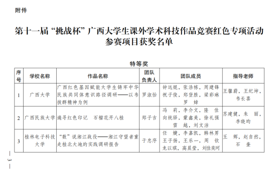 根据《关于组织开展第十一届“挑战杯”广西大学生课外学术科技作品竞赛的通知》(桂青联发〔2023〕3 号)精神,经过参赛团队自愿报名、学校推荐、区赛评审等环节,由大赛评审委员会评审、组织委员会审定,最终评出特等奖3项、一等奖8项、二等奖16项、三等奖24项。