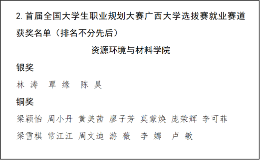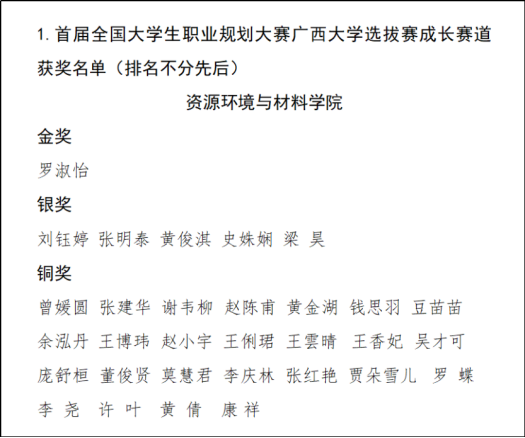 近日,首届全国大学生职业规划大赛广西大学选拔赛结果揭晓,经过初赛、复赛和决赛等环节,我院共有47名选手分获成长赛道和就业赛道金、银、铜奖。其中,来自环境工程212班的罗淑怡同学获得成长赛道金奖,成功晋级区赛。