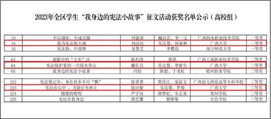 近日,由自治区教育厅、司法厅主办的“我身边的宪法小故事”征文活动圆满结束。经过个人申请、学院初审、学校复审、专家评审等环节,我院材科232班刘洁仪、材科233班戴灴月、物创231班徐应紫同学分获本次主题征文比赛高校组别一、二、三等奖。