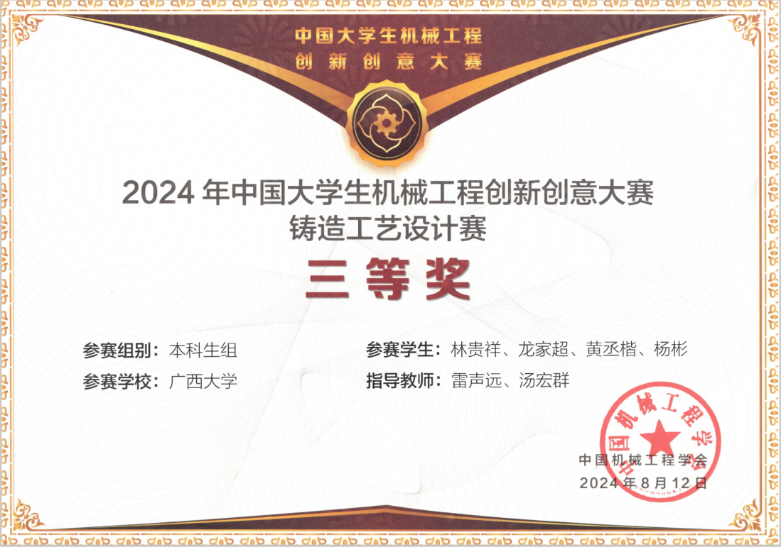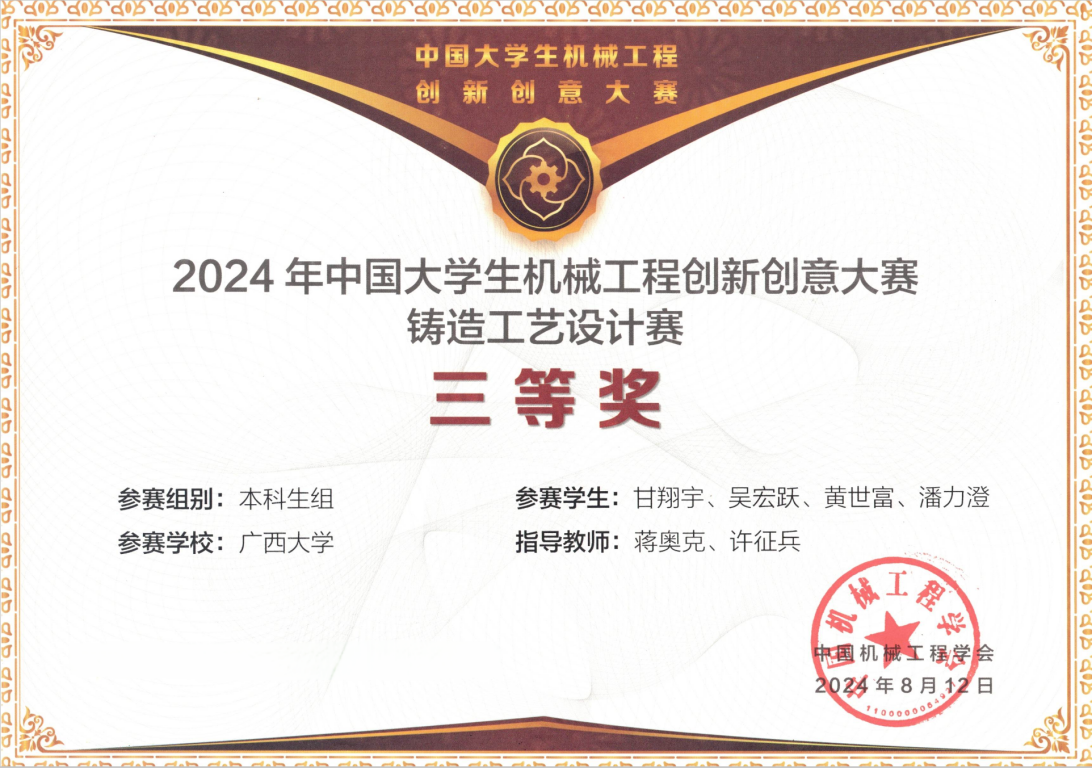 近日,2024 年中国大学生机械工程创新创意大赛铸造工艺设计赛全国总决赛圆满落幕,全国100多所高校同场竞技,展开激烈角逐。最终,我院材料成型及控制工程专业两个团队荣获全国三等奖2项。 由中国机械工程学会主办、中国机械工程学会铸造分会承办的“中国大学生机械工程创新创意大赛:铸造工艺设计赛”旨在为材料成型相关专业在校学生提供社会实践平台,鼓励学生主动跟踪铸造科技发展,学习铸造专业知识,提高铸造工艺设计和操作技能,提升科技创新与工程实践能力,为铸造行业培养优秀专业人才。 我院将以此次比赛为契机,积极探索专业教学改革,秉持“以赛促学、以赛促教、以赛促研、以赛促创”的理念,引导学生深入企业交流实践,激发学生对专业领域前沿技术的浓厚兴趣与探索热情,培养具有发现、分析、解决复杂工程问题能力的拔尖创新人才。 编辑|周大淇 审核|吴达慧