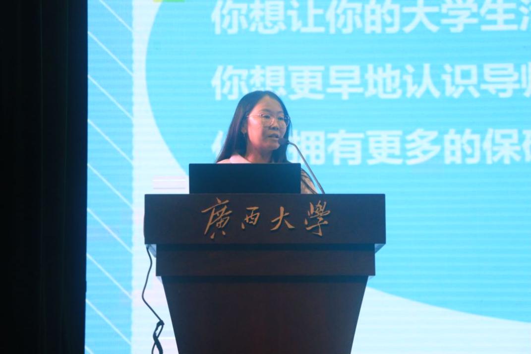 吴达慧副书记介绍学校、学院发展历程、学科设置、科研成果、实践活动等情况后,作“安全文明法纪”主题教育,强调要提高安全防范意识与能力,加强政治、网络、个人信息、健康、财产、交通等安全;熟读、熟记《广西大学学生手册》,严守各项管理规定,不断锤炼执行力、洞察力和免疫力;遵守社会公德秩序,牢守校园文明礼仪,恪守学术规范,诚信做事、做人。