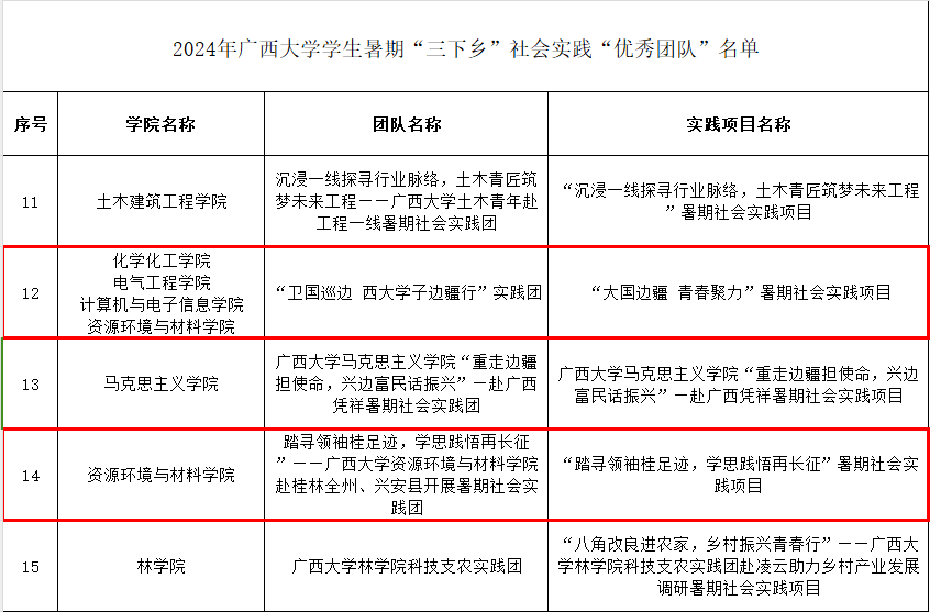 近日,学校团委通报表扬了一批在2024年“三下乡”暑期社会实践活动中表现突出的优秀集体、团队和个人。经学院申报推荐、组织评议等环节,最终确定若干名社会实践优秀单位、优秀团队、先进个人和优秀品牌项目。 其中,我院组织参与的“卫国巡边 西大学子边疆行”四院联合实践团、“踏寻领袖桂足迹,学思践悟再长征”——广西大学资源环境与材料学院赴桂林全州、兴安县开展暑期社会实践团荣获社会实践优秀团队,材料科学与工程223班宁冬兰同学荣获社会实践“先进个人”。 今后,学院将进一步总结实践经验,增强工作合力,组织广大青年学子积极投身社会实践与服务,不断加强社会实践活动的长效工作机制建设,引领和教育广大青年学生在实践中受教育、长才干、作贡献,在社会实践中焕发青春风采。 编辑|周大淇 审核|吴达慧