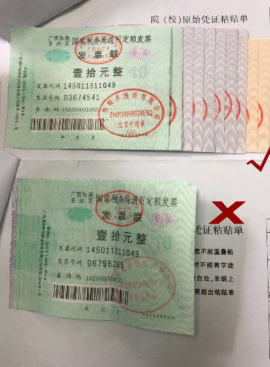 5.小于A4纸的发票应按阶梯状分类整齐地贴在“广西大学原始凭证粘贴单”上,写清楚单据张数和金额,由经费项目负责人、经办人和验收人签字。发票不允许贴在粘贴单装订线的左边,票不能贴在票的上面,以免票面信息被粘住看不见,每张发票都要贴在粘贴单上。