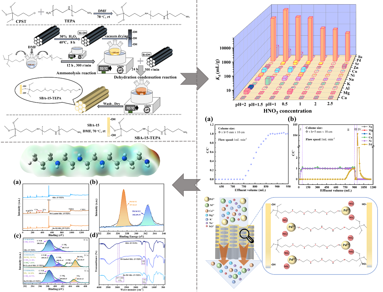 为解决铂族元素矿藏资源稀缺,矿产浓缩造成大量的污染,实际工厂中大量含钯废液的排放对环境和人体的危害等现实问题。本工作通过一种新的方法,以介孔二氧化硅(SAB-15)作为载体,制备了新型的氨基化介孔硅基吸附剂(SBA-15-TEPA)。通过对静态实验结果表明,SBA-15-TEPA对Pd(II)具有超高的选择性、更快的动力学、高的吸附容量以及优良的可循环性能。为验证SBA-15-TEPA潜在的实际应用价值,进行了柱层析穿透实验。结果显示,SBA-15-TEPA实现了在超高的废液处理量下对Pd(II)的完全分离和高浓缩,回收率接近100%。最后研究通过多种表征手段和DFT计算对材料的吸附机理进行详细分析。本研究成果为氨基功能化材料的制备和含钯废液的处理提供了新的观点和处理方式。