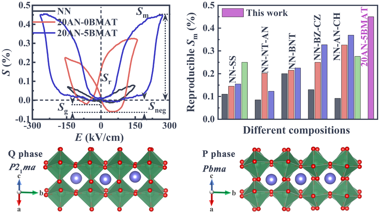 利用钙钛矿材料电致应变特性制成的驱动器,具有位移精度高、响应快速等优点,已被广泛应用于半导体光刻、激光通讯等领域。然而,多数铁电陶瓷的电致应变数值较小(~0.1%)且往往具有大的负应变和剩余应变,限制了其应用前景。反铁电陶瓷因初始反铁电相和电场诱导铁电相间巨大的结构差异而有望获得大的应变,同时又因反铁电-铁电相变的可逆性使得负应变和剩余应变为零,使得其具有广泛的应用前景。