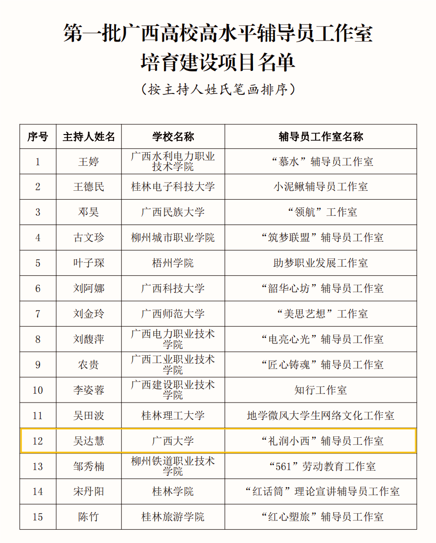 近日,自治区教育厅公布了第一批广西高校高水平辅导员工作室培育建设项目名单,我院党委副书记吴达慧主持的“礼润小西”辅导员工作室突出重围,成功入选,这是我校辅导员队伍建设的标志性成果!