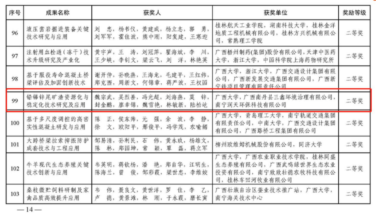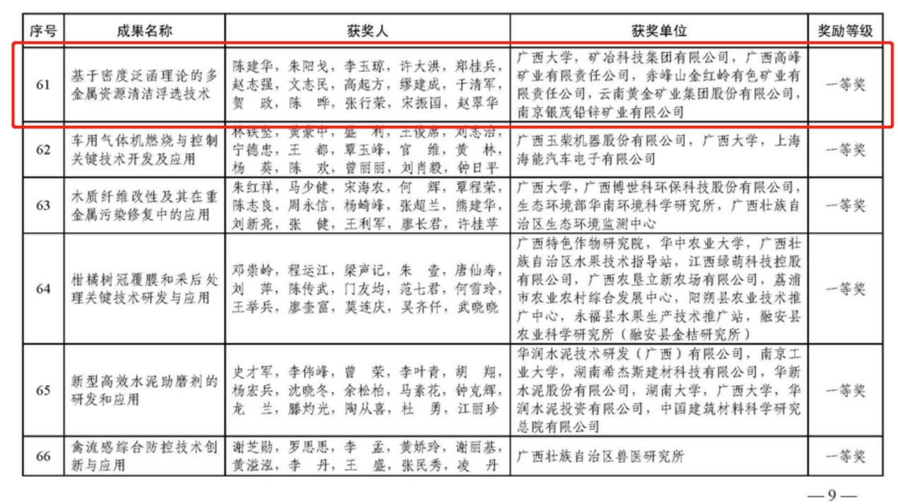 日前,广西科学技术奖励委员会办公室根据《广西壮族自治区人民政府关于2021年度广西科学技术奖励的决定》(桂政发〔2022〕12号)要求,公布2021年度广西科学技术奖奖励名录,我院教师团队斩获2项奖励。其中陈建华老师团队成果“基于密度泛函理论的多金属资源清洁浮选技术”荣获科技进步一等奖,魏宗武老师团队成果“铅锑锌尾矿渣资源化与稳定化技术研究及应用”荣获科技进步二等奖。
