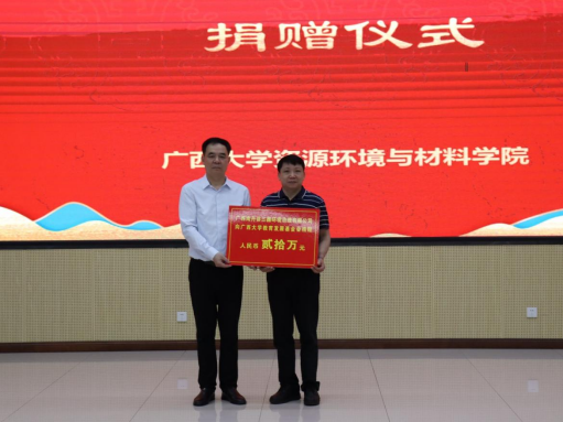 致辞后,校友办副主任潘正荣和广西南丹县三鑫公司董事长莫锌分别代表校企双方参与捐赠授牌仪式。三鑫公司向广西大学捐赠20万元作为教育发展基金,用于学校人才培养、科学研究、学科发展和学院项目建设。