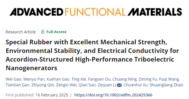 近日,我院 “结构热力学与微纳化工”课题组在特种橡胶的研制与应用方面取得突破,研究成果以“Special Rubber with Excellent Mechanical Strength, Environmental Stability, and Electrical Conductivity for Accordion-Structured High-Performance Triboelectric Nanogenerators”为题发表在国际顶级学术期刊Advanced Functional Materials上。论文第一作者为我院高伟副教授,通讯作者为李泽权助理教授,广西大学是唯一通讯单位。该工作得到化学化工学院赵双良教授和徐传辉教授的大力支持。