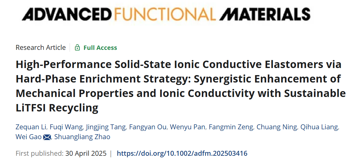 近日,我院“高分子及结构板材”团队在固态离子导电弹性体研究方面取得新进展,研究成果以High-Performance Solid-State Ionic Conductive Elastomers via Hard-Phase Enrichment Strategy: Synergistic Enhancement of Mechanical Properties and Ionic Conductivity with Sustainable LiTFSI Recycling为题,发表在国际知名期刊Advanced Functional Materials上。文章第一作者为助理教授李泽权,通讯作者为副教授高伟,广西大学是唯一通讯单位。