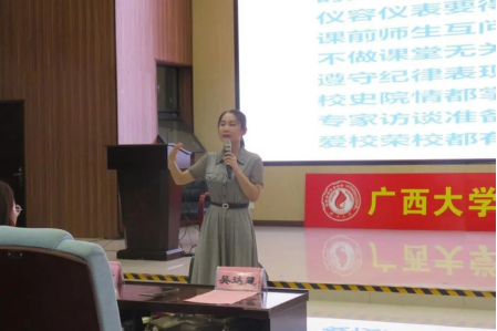 广西革命纪念馆黄敏老师以“十月一日国庆节”的由来和重要意义入手,向大家介绍了以韦拔群、谭寿林为代表的革命人物故事,讲述湘江战役红色故事,号召同学们要不断弘扬以爱国主义为核心的中华民族精神,把“个人小我”融入“集体大我”,在助力国家建设、院校发展的奋斗中实现人生价值。