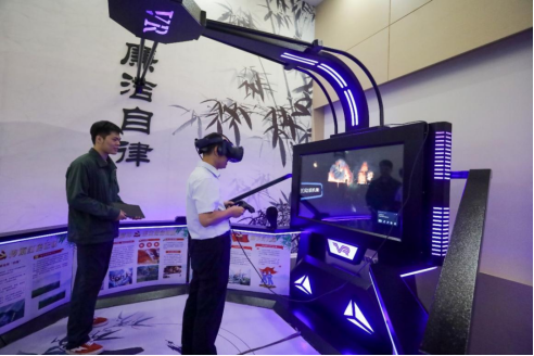 学院党委书记沈大强在竹廉文化智能生态展示馆内体验VR设备