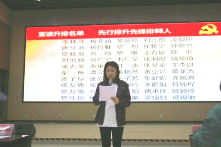 全场齐唱共青团团歌后,先行连第六届连长吴作洋作工作总结,汇报了先行连的理论学习、日常管理和连内活动开展情况。随后,陈宏老师和王馨蔚老师分别宣读新任干部名单和升排名单。