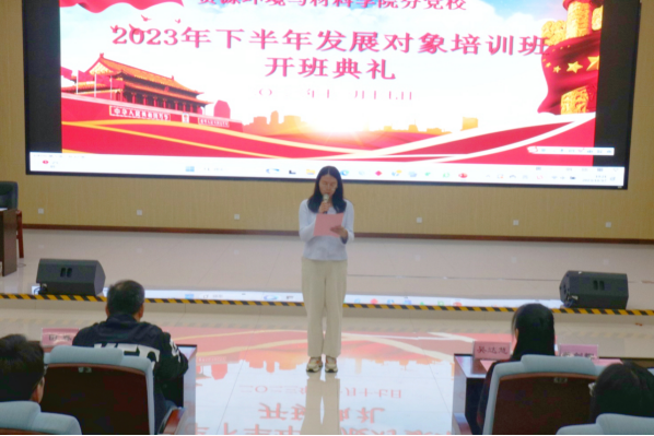 环境专硕221班杨可盈同学作为学员代表发言。她表示,“中国共产党党员”不仅是一种身份和称号,还意味着一份责任与使命,更代表着在困难面前果敢决绝、甘为民众利益作牺牲的精神。所有学员都应积极向党组织靠拢,做到在思想上、在行动上入党。