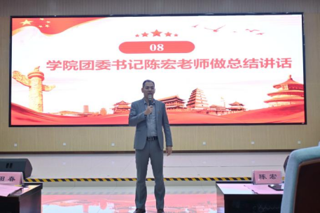 最后,学院团委书记陈宏老师作总结讲话。他充分肯定了研究生先行连本学期的工作和取得的成就,并对先行连下一学期的工作进行指导。此外,他提出三点要求和期望:第一,全体连员要重视学习党的理论知识,用科学的理论武装头脑、指导实践;第二,敢于担当,善于作为,积极参加社会实践活动;第三,锤炼专业本领,不断追求卓越,立大志、明大德、成大才、担大任,争取在所学专业领域创新创造,努力成为堪当民族复兴重任的时代新人!