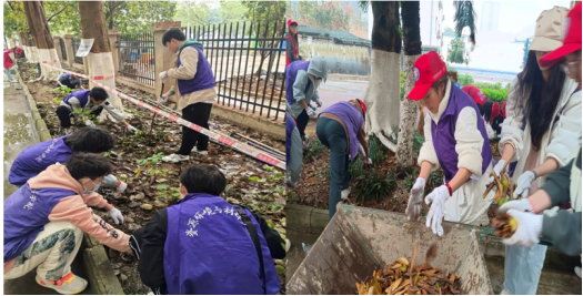 志愿者清理园区垃圾和绿化带落叶