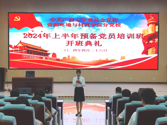 为加强理论学习和思想教育,提升学生党员的政治素养,4月26日,资源环境与材料学院2024年上半年预备党员培训班在学院123报告厅顺利开班。学院党委书记沈大强、培训班班主任田春、全体学生预备党员参加开班典礼。