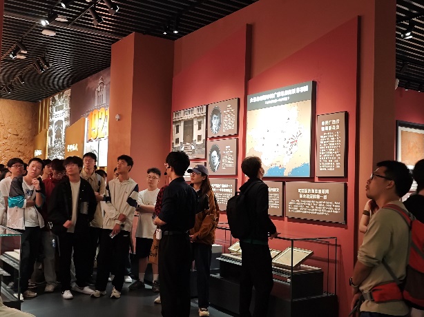 为学习贯彻习近平文化思想特别是习近平总书记关于用好红色资源的重要指示精神,加强新时代爱国主义教育,10月27日,我院物创本科生党支部前往广西壮族自治区博物馆开展“探寻红色基地,培育爱国情怀”主题党日活动。 我院物创本科生党支部开展主题党日活动 通过参观“烽火南疆”展馆所呈现出广西在抗战期间的历史足迹,青年党员团员深刻理解到广西作为祖国南大门在国家近现代历史中所扮演的重要角色。通过讲解员的详细介绍,大家了解到许多英勇抗战的事迹,尤其是广西人民在艰苦岁月中表现出来的无私奉献精神。 聆听讲解员讲述广西革命历史 在此次主题党日活动中,青年党员团员深刻体会到了历史与文化的强大力量,不仅亲眼见证了各类物质文化的传承,更在内心深处感受到了精神文化的强烈共鸣,增强了作为新时代大学生的责任感与使命感。 编辑|周大淇 审核|吴达慧