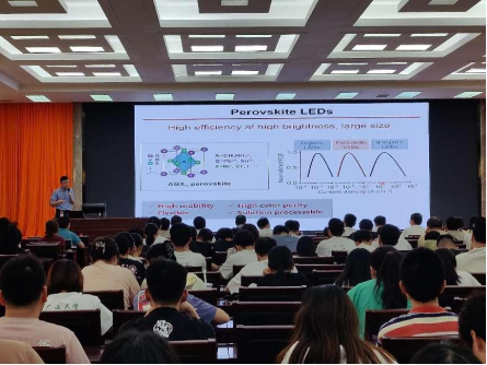 报告详细介绍了钙钛矿LED的高效率和高亮度等显著优势,着重探讨了钙钛矿LED在效率、稳定性以及有毒物质铅(Pb)引起的广泛关注。王建浦教授深入阐述了LED的工作原理,重点讲解了提高LED发光层的结晶质量以及提高LED光子输出的耦合效率的方法,这些方法在环保型锡(Sn)基钙钛矿LED中实现了外量子效率超过10%的世界纪录值。